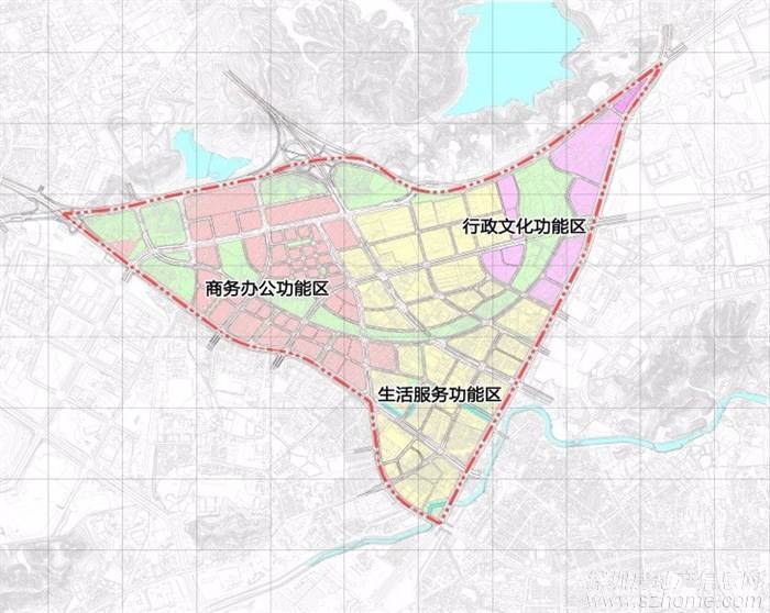 总体布局:规划形成“半月环绿廊串联商务办公功能区、生活服务功能区、行政文化功能区”的空间结构方案。
