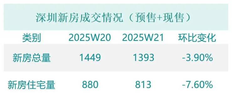 据深圳市房地产信息平台数据,2025年第21周全市新房(预售+现售)成交1393套,环比下降3.9%。