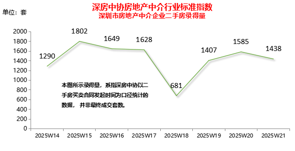 经深房中协统计,2025年第21周全市二手房(含自助)录得1,438套,环比下降9.3%。二手房周录得量未能延续增长态势,呈高位波动走势。