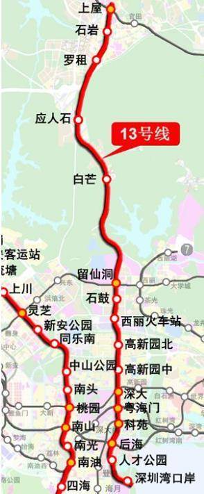 13号线一期从南至北站点为深圳湾口岸站、登良东站、后海站、科苑站、深大东站、深大站、科兴站、松坪站、西丽火车站、石鼓站、留仙洞站、白芒站、应人石站、罗租站、宝石站、上屋北站。