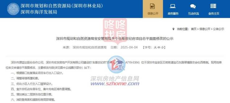 近日,深圳市规划和自然资源局宝安管理局发布《关于名峯世纪府项目总平面图修改》。