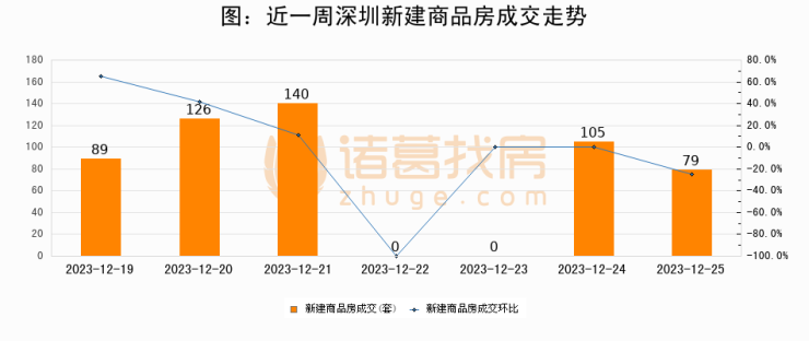 根据深圳市住房和城乡建设局数据显示,2023年12月25日深圳新建商品房成交79套,较昨日减少26套,环比下降24.8%