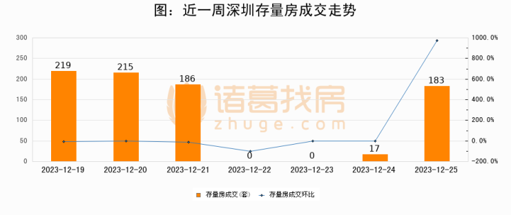 从存量房来看,2023年12月25日深圳存量房单日成交183套,比昨日增加166套,环比上涨976.5%。从近一周存量房成交来看,深圳存量房日均成交套数为117套,12月25日单日成交183套,高于近一周平均水平56.4%。