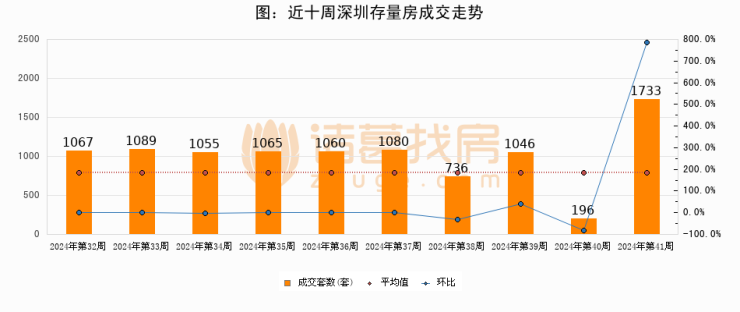 存量房方面,第41周深圳存量房成交1733套,较上周增加1537套,环比上涨784.2%。从近十周成交走势来看,周均成交套数为1012套,本周高于平均水平71.2%。