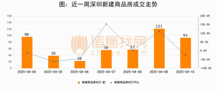 根据深圳市住房和城乡建设局数据显示,2025年04月10日深圳新建商品房成交93套,较昨日减少28套,环比下降23.1%