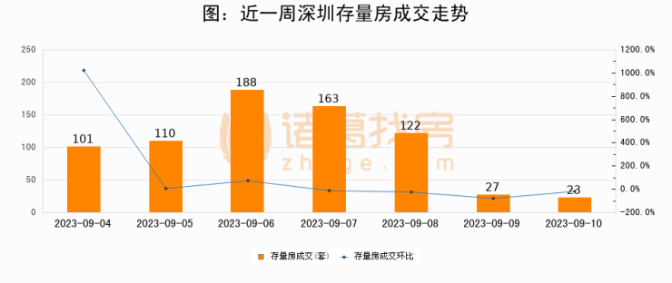 从存量房来看,2023年09月10日深圳存量房单日成交23套,比昨日减少4套,环比下降14.8%。从近一周存量房成交来看,深圳存量房日均成交套数为104套,09月10日单日成交23套,低于近一周平均水平77.9%。
