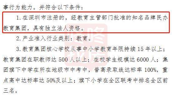 学校举办者基本条件显示,学校举办者基本条件中,提到须为在深圳市注册的,经教育主管部门批准的知名品牌民办教育集团。