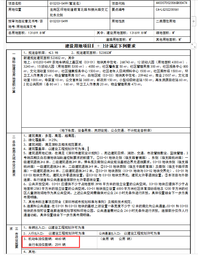 根据规划显示,项目土地面积131619.81平方米,建面523832平方米,共分为两宗地,住宅面积分别是:268743平方米及209462平方米,商业21507平方米,幼儿园两所,分别为4300平方米(12班)及5300平方米(15班),规划机动车位4860辆。