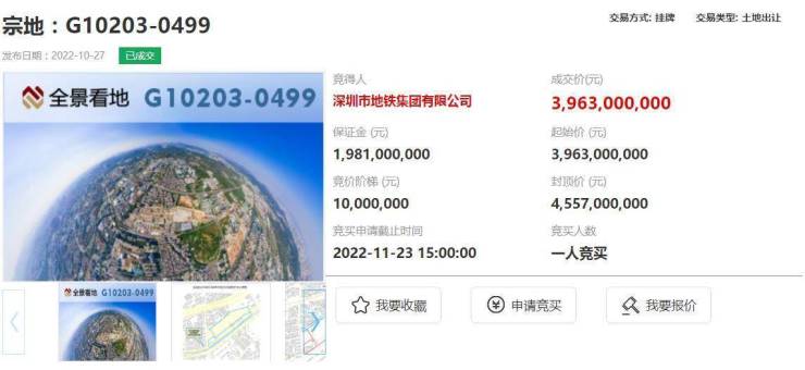 其中,位于龙岗区坪地街道的G10203-0499宗地一人竞买,最终由深圳市地铁集团有限公司底价成交,成交金额396300万元。