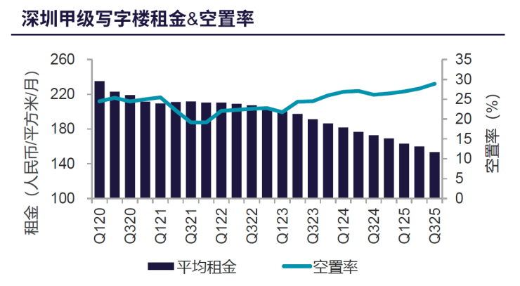 截至2025年三季度末,随着新增项目陆续投入使用,全市甲级写字楼存量规模攀升至887.9万平方米。从供应分布来看,本季度新增供应集中于前海片区,有助于推动该片区商务氛围及相应配套设施的进一步完善。然而,新增供应的集中释放亦进一步加剧市场供需不平衡的状况,使得全市甲级写字楼空置率较上季度上升1.2个百分点至29.0%。激烈的市场竞争促使业主加大租金让步力度,三季度全市甲级写字楼平均租金进一步下探至每月每平方米153.4元,环比下降4.2%、同比下降11.2%。租金下行与新增供应刺激下,三季度全市净吸纳量达到9.2万平方米,创下2024年以来的季度新高。