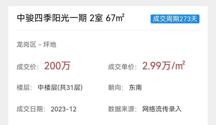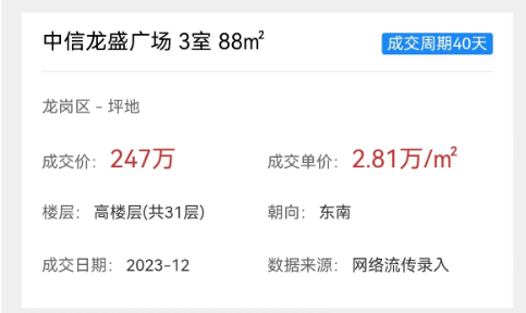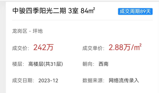 据行舟深房小程序成交数据显示,中信龙盛广场12月成交的88㎡3房单价约2.81万/㎡,而中骏四季阳光在12月成交的两套单价也在2.9万/㎡左右。