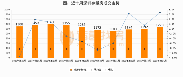存量房方面,第34周深圳存量房成交1273套,较上周增加81套,环比上涨6.8%。从近十周成交走势来看,周均成交套数为1261套,本周高于平均水平1%。