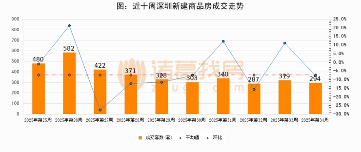 进入2025年第34周(08月18日-08月24日),深圳新建商品房成交294套,较上周减少25套,环比下降7.8%