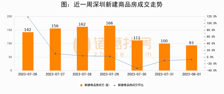 根据深圳市住房和城乡建设局数据显示,2023年08月01日深圳新建商品房成交93套,较昨日减少7套,环比下降7%