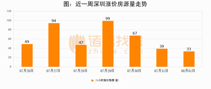 根据诸葛找房数据显示,深圳24小时涨价房源量为33套,较07月31日减少6套,环比下降15.4%。与此同时,涨价房源占比小幅回落,对于购房者来说是一个入市窗口期,购房者可抓住时机入市。