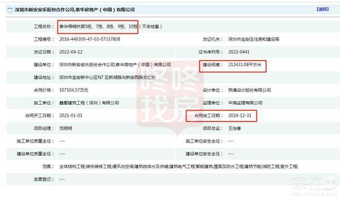 家在深圳网友爆料,4月12日,宝安中心区泰华梧桐林居5栋、7-10栋主体结构工程等建设获批施工许可证,项目将于2024年竣工。