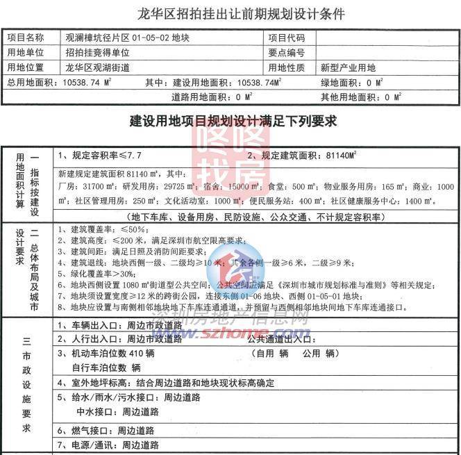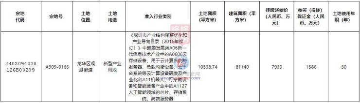 宗地号A909-0166,土地位置龙华区观湖街道,土地用途新型产业用地,土地面积10538.74平方米,建筑面积81140平方米,挂牌起始价7930万元,土地使用年限30年。