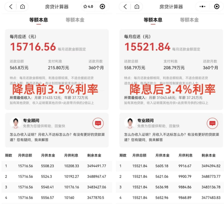 按总价500万30年的商业贷款计算,等额本息还贷方式下,从3.5%的利率变为3.4%的利率,购房者每月的房贷成本降了194.72元,30年房贷少支付7.01万元。