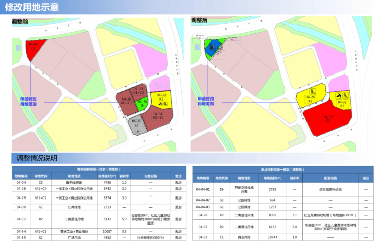 一、04-28、04-29、04-30地块优化合并为04-28地块,用地面积8095㎡,土地性质由原来的工业+商办+公共绿地,变更为二类居住用地,容积率3.1,配套设施为社区儿童游戏场地(场地面积300㎡);