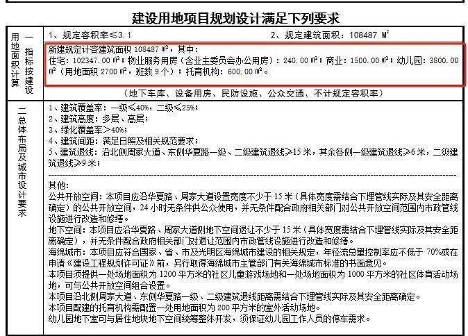 根据规划设计要点,地块容积率3.1,规划住宅102347㎡,商业1500㎡,9班幼儿园3800㎡,托育机构600㎡,物业服务用房240㎡。