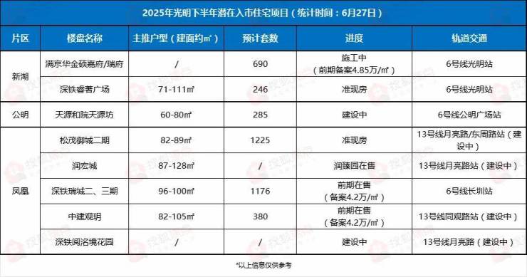 @搜狐焦点不完全不完全统计,光明下半年预计有7盘入市,其中包括润宏城、满京华金硕系、深铁瑞城等3大项目可能保持持续加推供应,后续单盘供应量较大的还有松茂御城二期,套数约1225套。