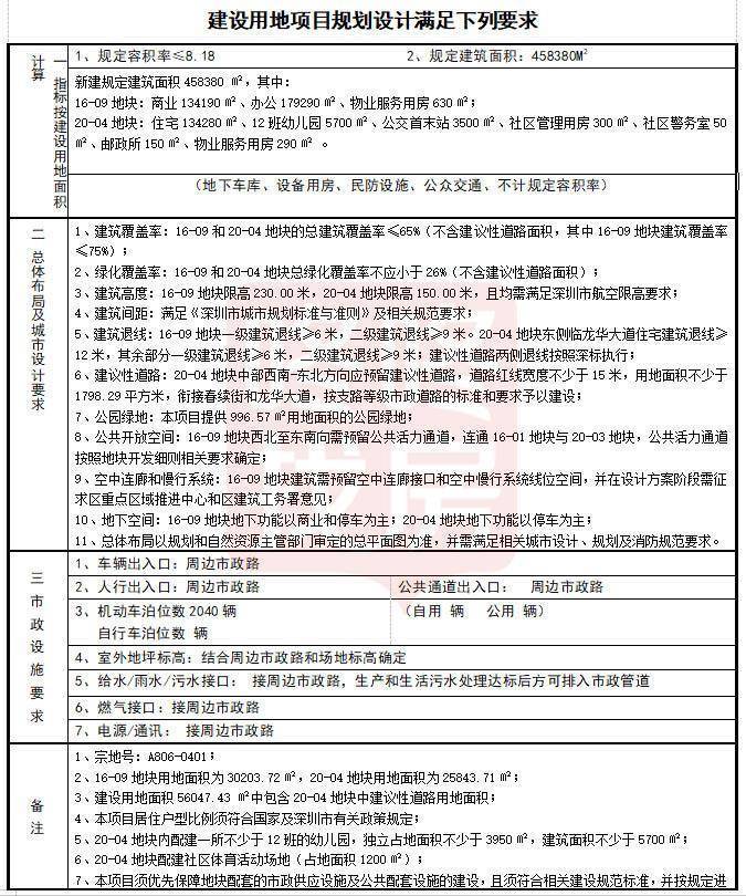 宗地土地面积约57044平方米,新建规定建筑面积458380 ㎡,其中:16-09地块:商业134190㎡、办公179290㎡、物业服务用房630㎡;20-04地块:住宅134280㎡、12班幼儿园5700㎡等。