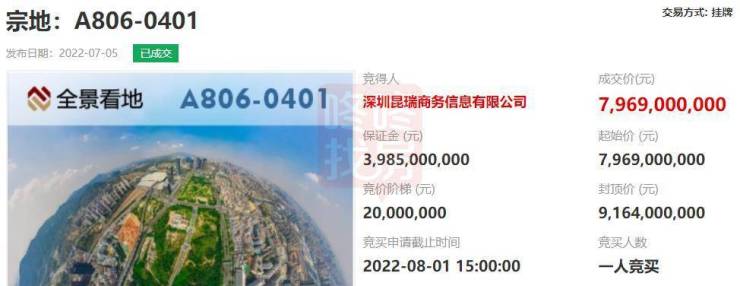 该地于2022年8月,深圳年度第二轮宅地集中出让中,由深圳昆瑞商务信息有限公司(华润)以底价79.69亿成交。建成后普通商品住房平均销售价格不高于72450元/平方米(不含室内装修价格)。