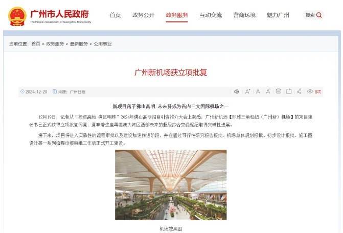 近日,广州新机场项目即珠三角枢纽(广州新)机场已正式获得国务院的立项批复,预计12月25日启动前期同步实施工程。此机场将成广东省内三大国际机场之一(另外两个为广州白云国际机场、深圳宝安国际机场)。
