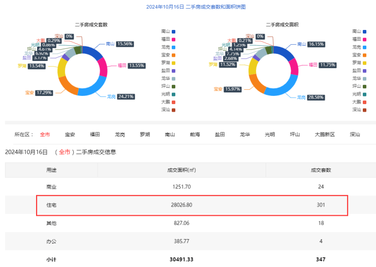 2024年10月16日二手房住宅网签301套。宝安47套;福田35套;龙岗81套;罗湖39套;南山52套;盐田10套;龙华21套;光明3套;坪山12套;大鹏1套。