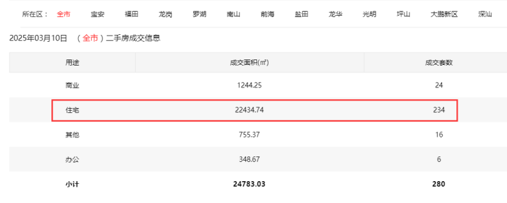 2025年3月10日二手房住宅网签234套。其中,宝安34套;福田47套;龙岗51套;罗湖26套;南山29套;盐田10套;龙华27套;坪山2套;光明6套;大鹏2套。
