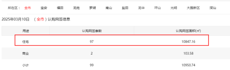 2025年3月10日新房住宅认购网签97套。其中,宝安22套;福田0套;龙岗13套;罗湖2套;南山23套;盐田2套;龙华19套;坪山3套;光明13套;大鹏0套;深汕0套。