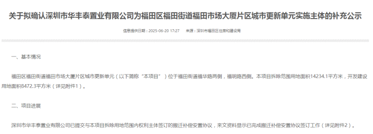 福田区福田市场大厦片区城市更新单元实施主体补充公告公示,项目实施主体拟为深圳市华丰泰置业有限公司。