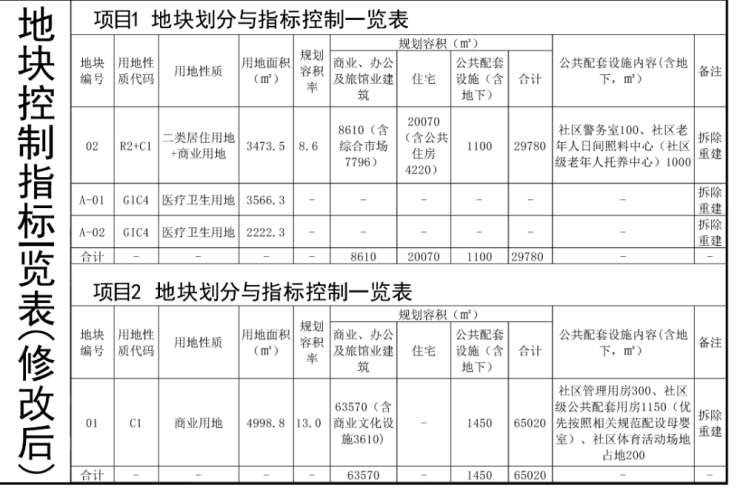 项目1:拆除用地面积9037.2平方米,开发建设用地面积3473.5平方米,规划容积29780平方米(其中商业、办公及旅馆业建筑8610平方米<含综合市场7796平方米>、住宅20070平方米<含公共住房4220平方米>、公共配套设施1100平方米),落实02地块、A-01地块、A-02地块及其周边部分规划市政道路的拆除责任,完成02地块的建设,重点落实社区警务室、社区老年人日间照料中心(社区级老年人托养中心)等公共配套设施和公共住房。