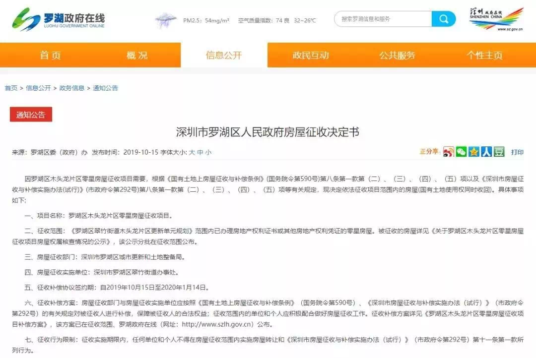 10月15日上午,罗湖区发布了《深圳市罗湖区人民政府房屋征收决定书》,对木头龙片区零星房屋进行征收。征收补偿协议签约期为2019年10月15日至2020年1月14日。