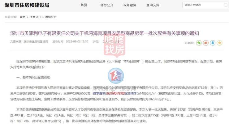 均价14880元/平!深圳1293套安居房网上认购,新规后首个项目配售