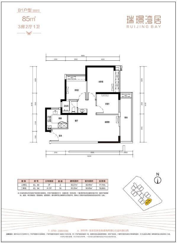 两房共有3种户型,分别为A1/A2/A3户型,全部为竖厅格局,得房率在78%左右。