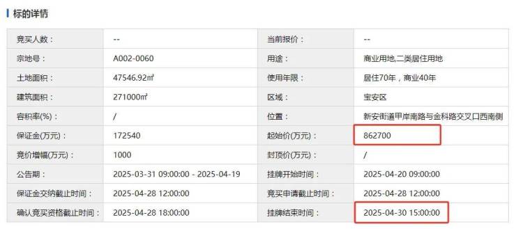 深圳公共资源交易中心显示,3月31日,宝中A002-0060宗地正式挂牌,宗地面积47546.92㎡,建筑面积271000㎡,起始价86.27亿元,预计4月30日出让。