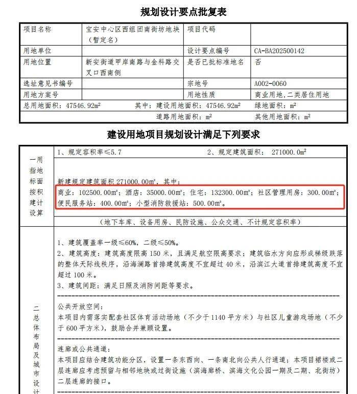 根据规划设计要点,项目建面271000㎡,其中包括住宅132300㎡;商业102500㎡;酒店35000㎡。