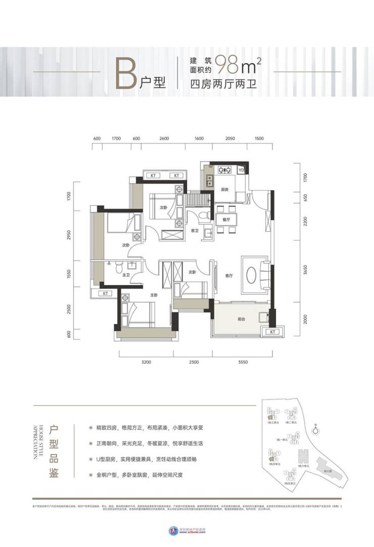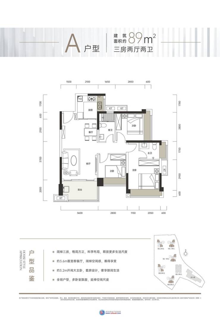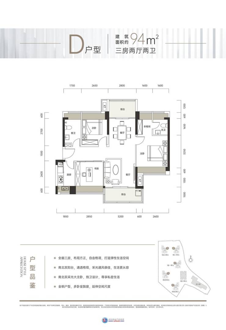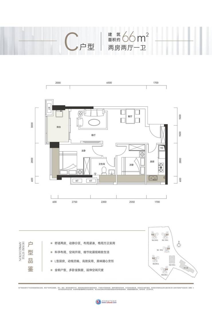 主推户型为66㎡两房两厅一卫、89㎡三房两厅两卫、94㎡三房两厅两卫、 98㎡四房两厅二卫,具体如下: