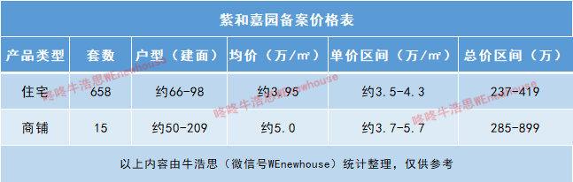 住宅户型区间约66-98㎡,备案均价约3.95万/㎡,单价区间约3.5-4.3万/㎡,总价区间约237-419万/套,住宅物业费3.9元/㎡;