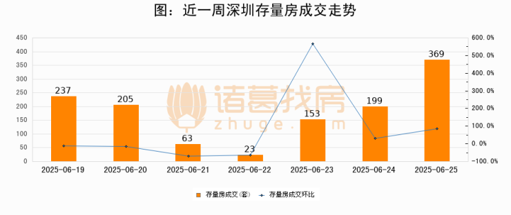 从存量房来看,2025年06月25日深圳存量房单日成交369套,比昨日增加170套,环比上涨85.4%。从近一周存量房成交来看,深圳存量房日均成交套数为178套,06月25日单日成交369套,高于近一周平均水平107.3%。