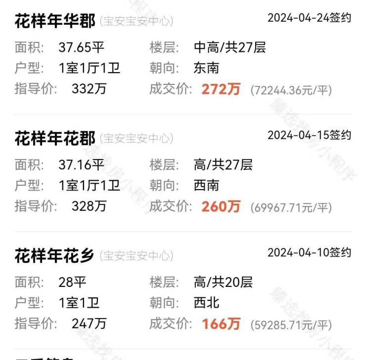 以挂牌价涨幅明显的宝中为例,区域内的花样年华郡、花样年花乡等住宅小区,近期的成交价都是低于指导价的。