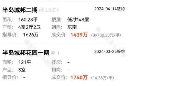 又如南山蛇口的半岛城邦小区,4月同样有住宅低于指导价成交了,当然这是极个别的房源,但小区对比高峰时期,降幅也不少,加上近一两年有多套法拍房源流入市场,也给二手房价格带来一定的冲击力。