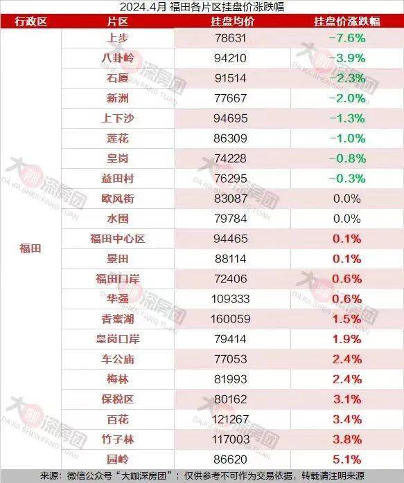最后市中心福田则有55%的片区挂牌价上涨,涨幅最大园岭与宝中一样,挂牌价上浮了5.1%;而香蜜湖、车公庙等核心片区,房价涨幅反而相对没有那么明显。