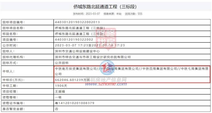 侨城东路北延通道工程(三标段)中标人中铁南方投资集团有限公司//中铁隧道局集团有限公司//中铁四局集团有限公司//中铁七局集团有限公司,中标金额662046.601239万元,中标工期1906天。