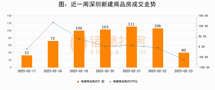 根据深圳市住房和城乡建设局数据显示,2025年02月23日深圳新建商品房成交40套,较昨日减少66套,环比下降62.3%
