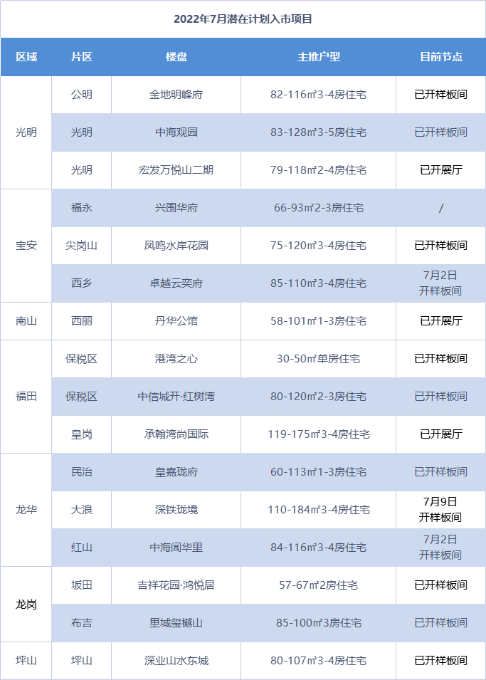 据血拼深圳楼市预计,7月潜在入市楼盘或有16个,其中,光明、宝安、福田、龙华均有3盘计划入市,南山、坪山各有1盘,龙岗有2盘。