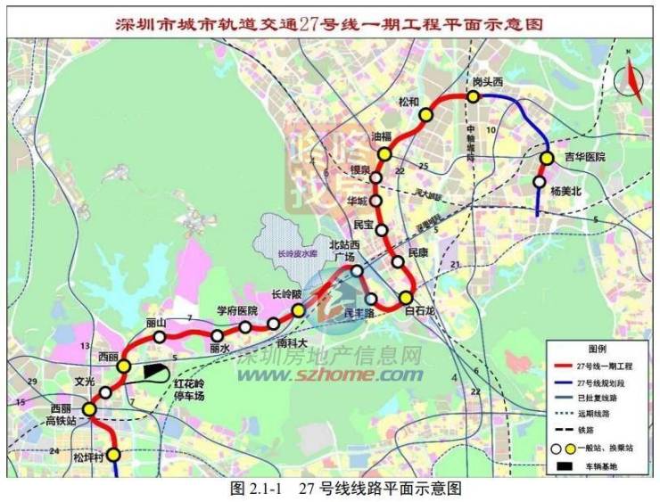 27号线一期工程联系西丽高铁新城、西丽湖国际科教城、深圳北站商务中心 及坂雪岗科技城。线路走向为:松坪山路——西丽南路——沙河西路——学苑大道 ——留仙大道——致远中路——玉龙路——白石龙路——龙华大道——民清路— —张衡路——环城路。