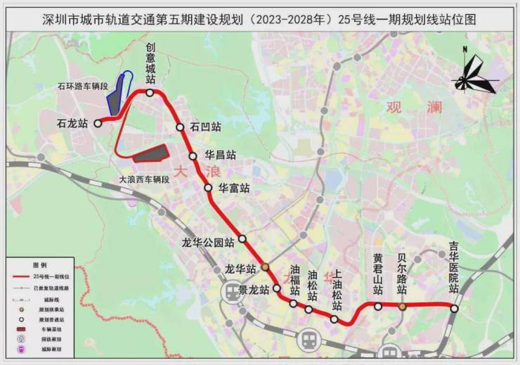25号线一期工程起自石龙站,终至吉华医院站,线路途经宝安石岩、龙华大浪、龙华中心、龙岗坂田等片区。