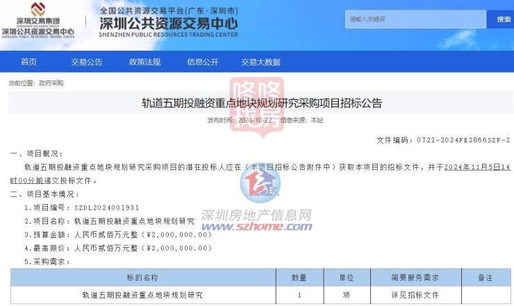 近日,深圳公共资源交易中心发布轨道五期投融资重点地块规划研究采购项目招标公告,招标估价200万。